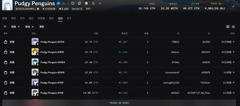 Pudgy Penguins: Taban fiyat 16,75 ETH (yaklaşık 63.600 dolar), 24 saatte %16,5 artış. 24 saatlik işlem hacmi: 1.698 ETH (yaklaşık 6,43 milyon dolar).