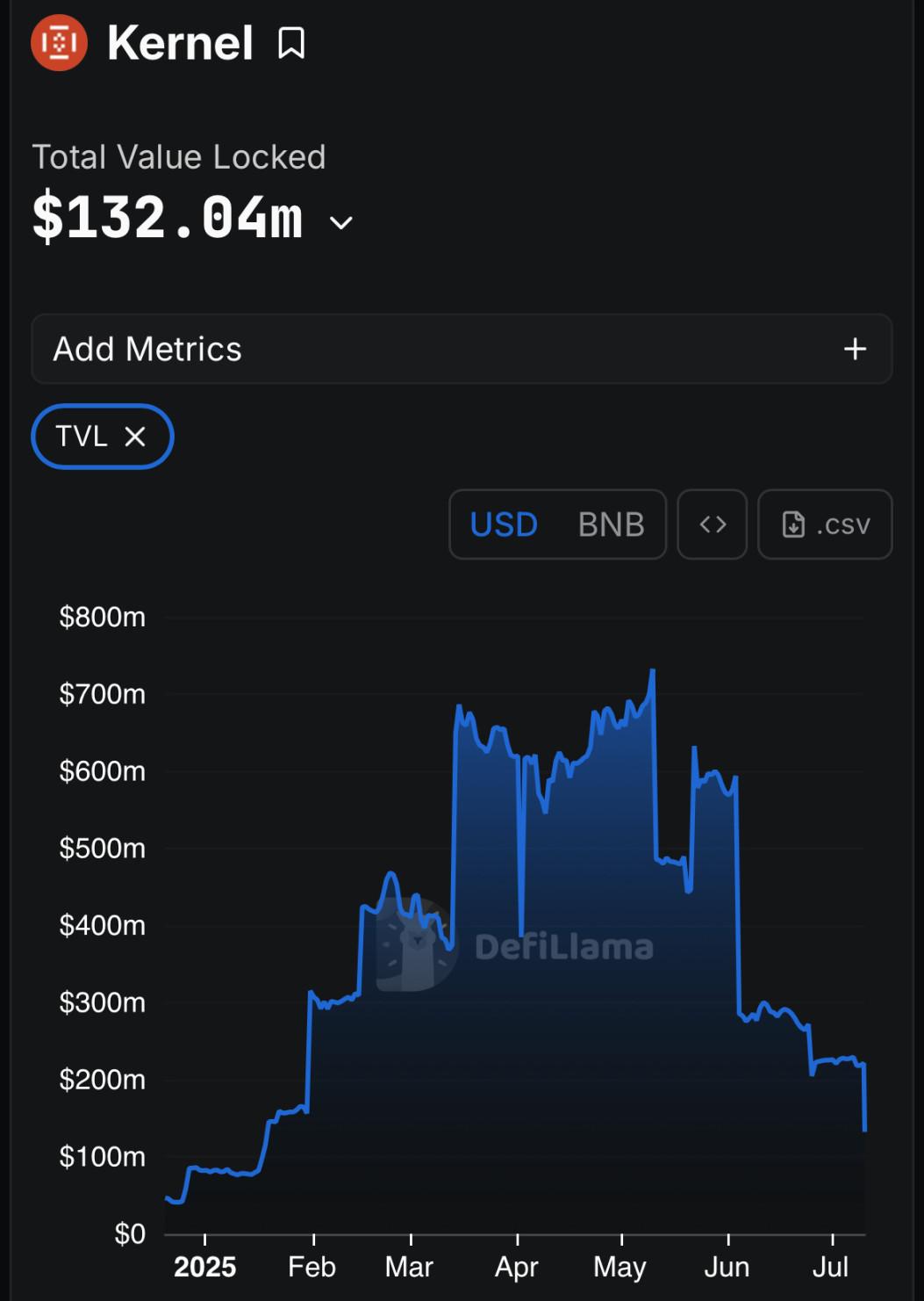 DefiLlama verilerine göre, 10 Temmuz 2025 itibarıyla Kernel DAO’nun kilitli toplam değeri (TVL) 1.47 milyar dolaraulaşmış olup, bunun yaklaşık 132 milyon doları Kernel’ın TVL’sidir.