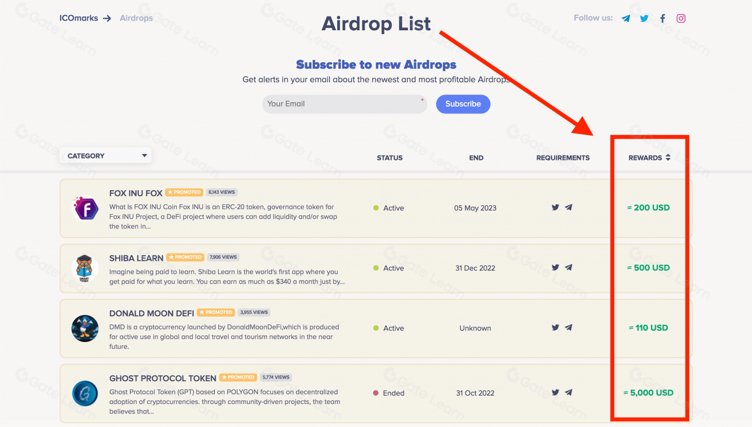 ICOMarks ayrıca, çoğu airdropun değerinin 50 ile 100 dolar arasında olduğunu tahmin eden tek airdrop derleyicisidir, airdroptan önce yaklaşık değeri tahmin eder.