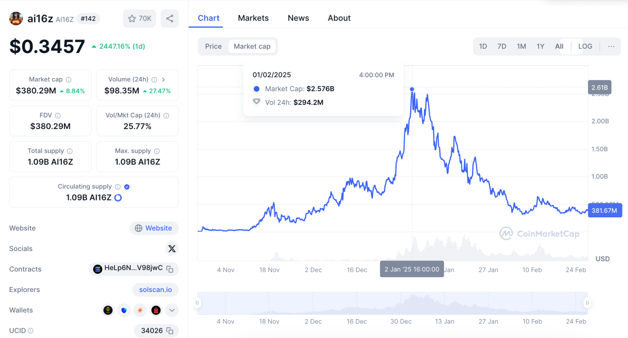 Ekim 2024’te piyasaya sürülen ai16z, 2025 başlarında 2.5 milyar dolarlık piyasa değerine ulaşarak bu eşiği aşan ilk Solana tabanlı AI tokenı oldu. Yenilikçi yaklaşımı, DAO modeli ve güçlü piyasa ilgisiyle alanda lider konuma geldi.