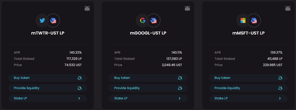 Bu tokenlar sadece Terraswap’te (o zamanlar Terra’nın DEX’i) 24/7 ticaret yapılabilir, Uniswap’taki token çiftleri gibi esnek bir şekilde; ayrıca ekosistemlerindeki başka bir borç verme protokolü olan Anchor Protocol’de teminat olarak kullanılabilir, borç almak veya faiz kazanmak için.