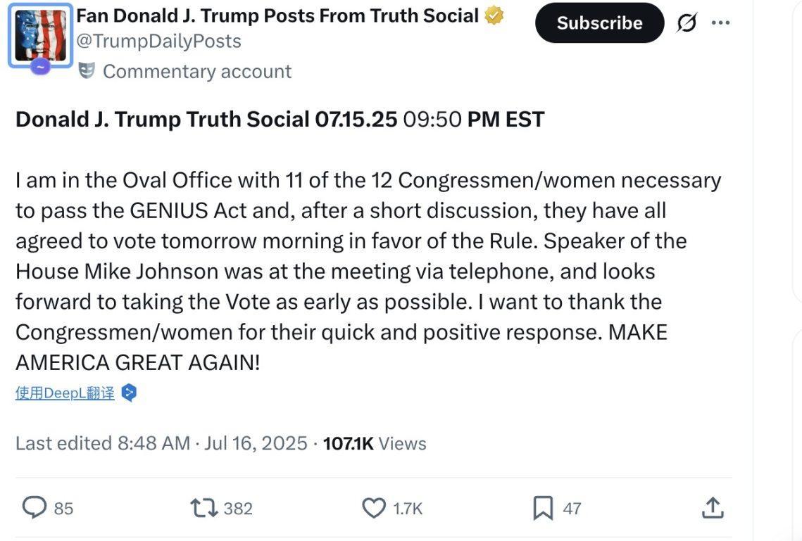 Raporlara göre, Başkan Trump yüzüne tokat atıldıktan sonra çok öfkeliydi. Temsilciler Meclisi’ndeki oylama başarısız olduktan sonra, Trump hemen GENIUS Yasası’nın yarın geçeceğini paylaştı ve bugün Oval Ofis’te 11 karşıt kongre üyesiyle bir araya gelerek “GENIUS Yasası” gibi yasama kurallarının geçişini tartıştı ve ertesi sabah kuralları destekleme konusunda bir uzlaşıya vardılar.