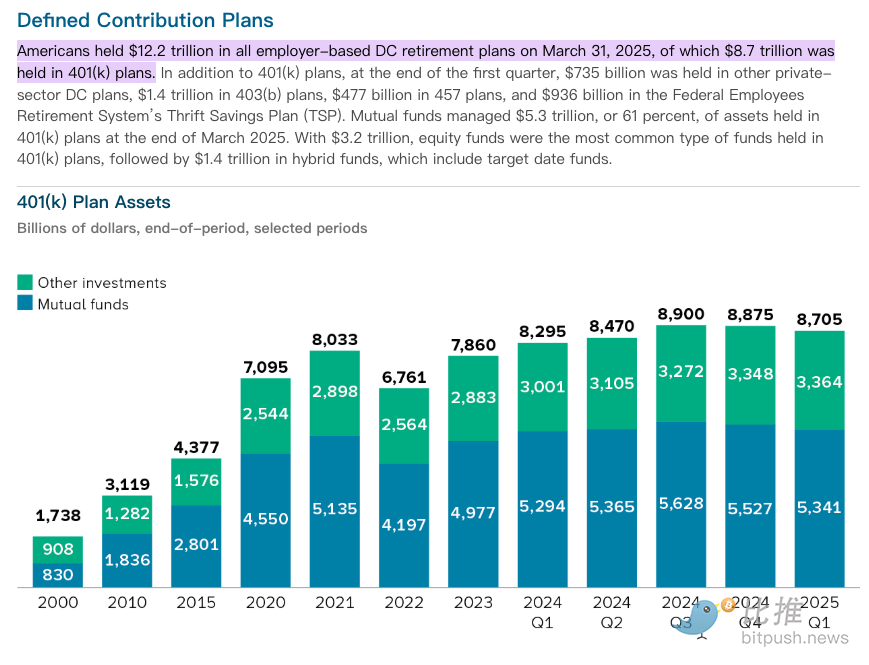 Kamuya açık verilere göre, 31 Mart 2025 itibarıyla işveren destekli tanımlı katkı (DC) emeklilik planlarının varlıkları 12,2 trilyon dolara yükseldi. Bunun 8,7 trilyon dolarlık kısmını 401(k) planları oluşturuyor.