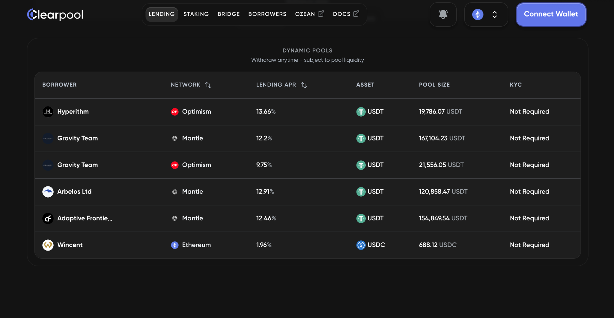 Platform, farklı piyasa katılımcılarının ihtiyaçlarını karşılamak üzere çift yapılı bir model benimser. Bir tarafta, kurumsal yatırımcıların kısa vadeli sermayeye etkin şekilde erişmesini sağlayan izinsiz ve tek borçluya özel havuzlar bulunur. Bu havuzlar arz-talep dinamikleriyle çalışır ve DeFi borç verenlerine riske göre ayarlanmış getiri sunar. Buna karşılık olarak Clearpool, yasal uyumluluğa odaklı kurumsal yatırımcılar için izinli ve kurumsal düzeyde bir toptan borç alma-verme platformu da sunar. Bu çift yapı, Clearpool’un bireysel DeFi meraklılarından büyük kurumsal oyunculara kadar geniş bir kullanıcı kitlesine özel çözümler sunarak hizmet verebilmesini sağlar.