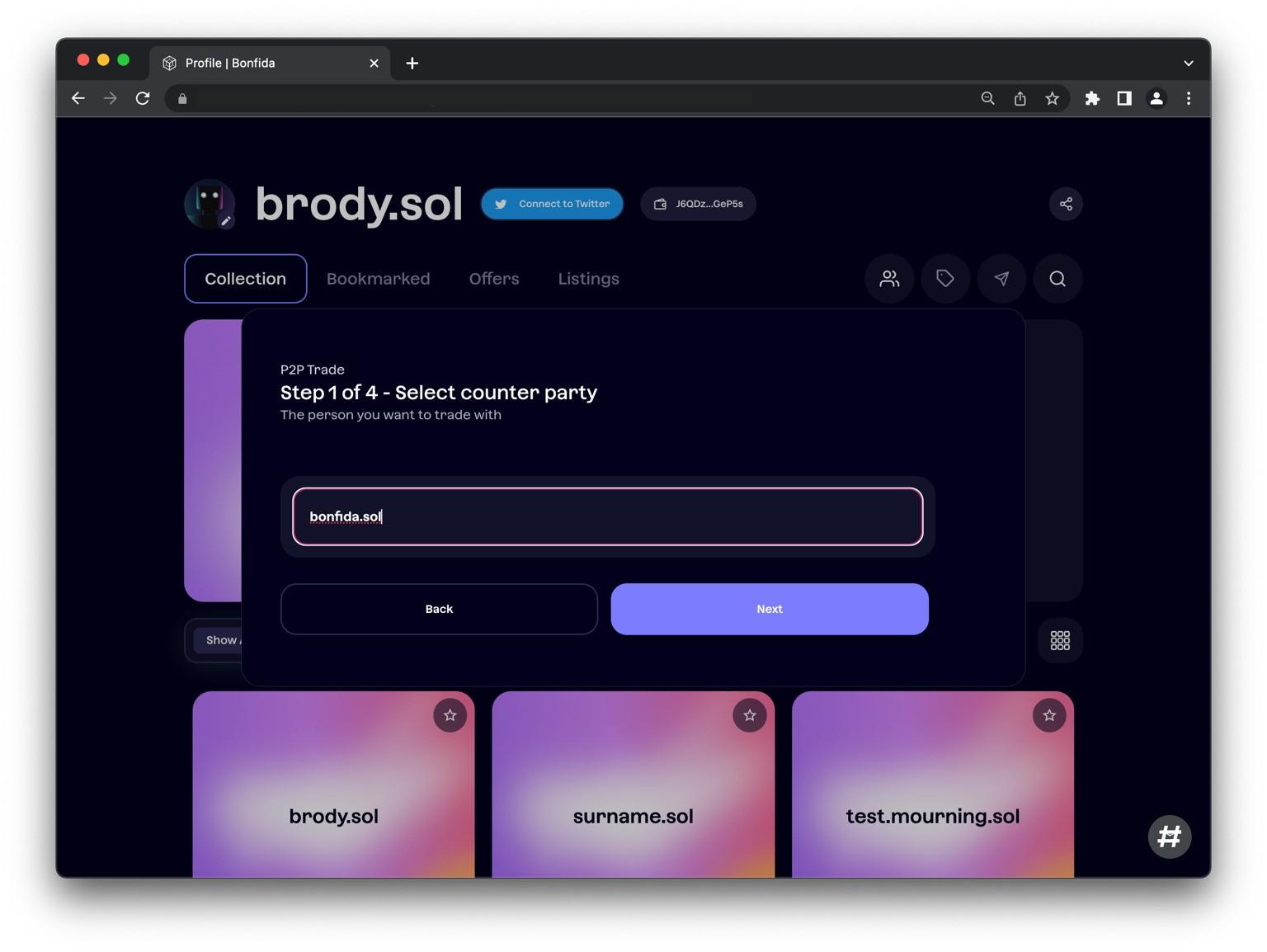 Daha özelleştirilmiş işlemler için eşler arası (P2P) alım satım da mümkündür. Bu modelde kullanıcılar, alan adı takası ve SOL token ekleyerek doğrudan diğer kişilerle pazarlık yapabilir. P2P işlemler, her iki tarafın da işlemi adil şekilde tamamlamasını sağlamak için güvenli “escrow” (emanet) hesapları ile korunur.