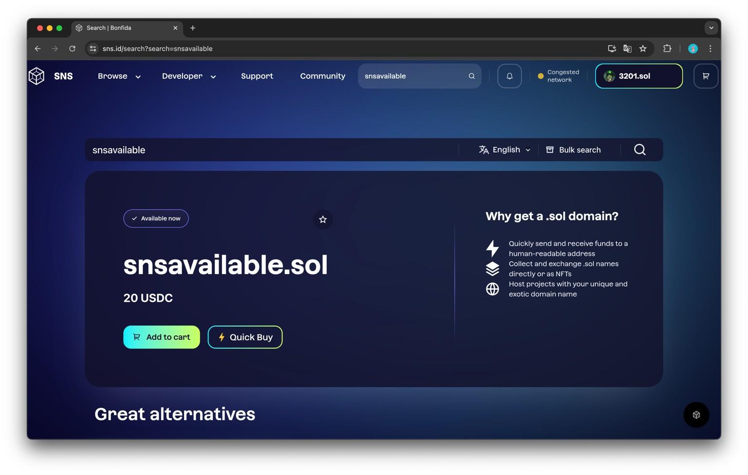 Güçlü işlem altyapısıyla SNS, merkeziyetsiz alan adı sahipliği için likidite, değer ve erişilebilirlik sağlar. Kullanıcıların gelişmekte olan Web3 kimlik ekonomisine tam katılımını mümkün kılarak Solana blokzincirinin kullanım alanını genişletir.