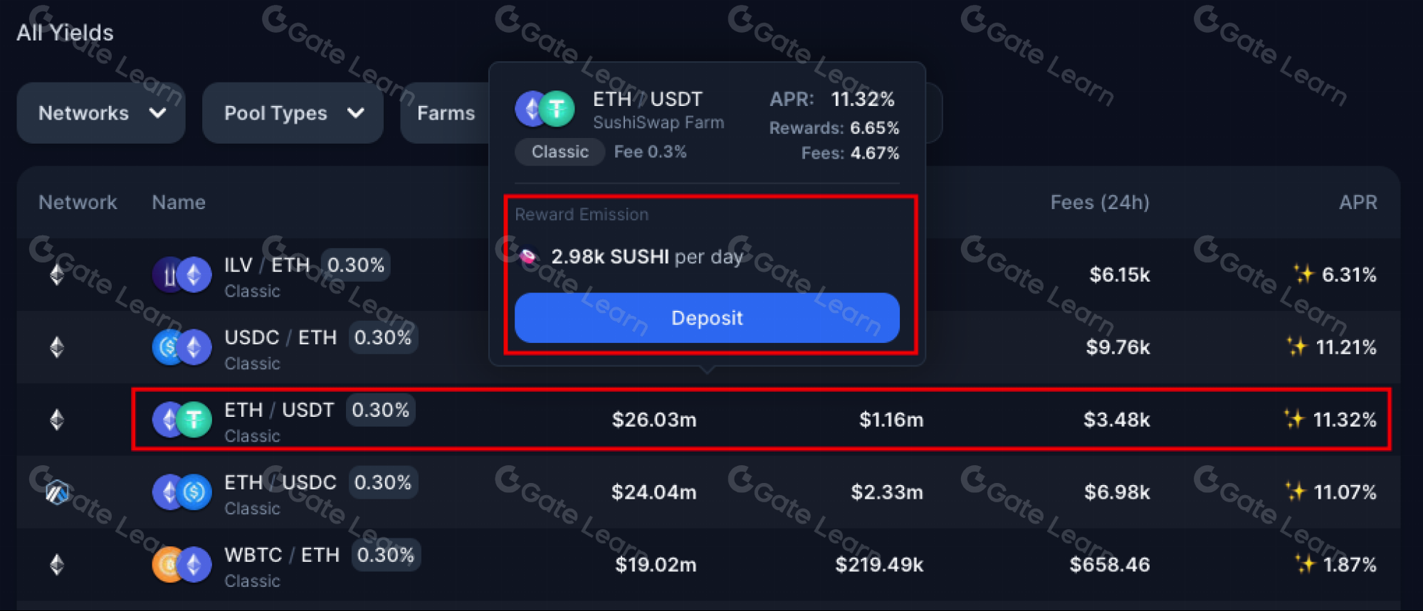SushiSwap’taki ETH/USDT likidite havuzları için SUSHI ödülleri.