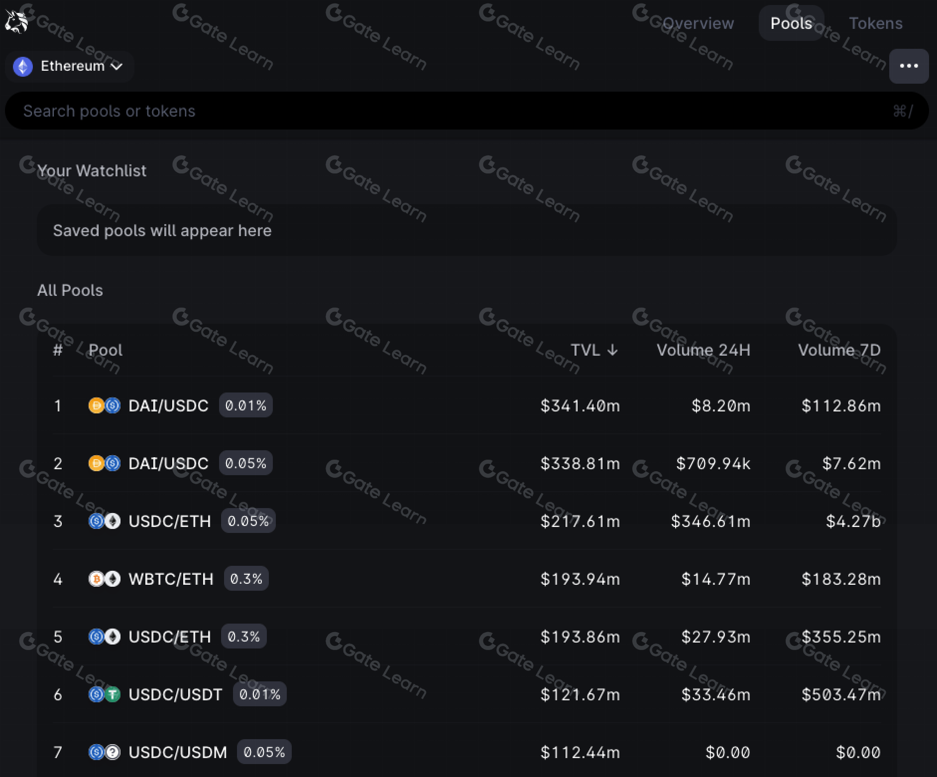 Uniswap’in resmi web sitesindeki likidite havuzlarının listesi.
