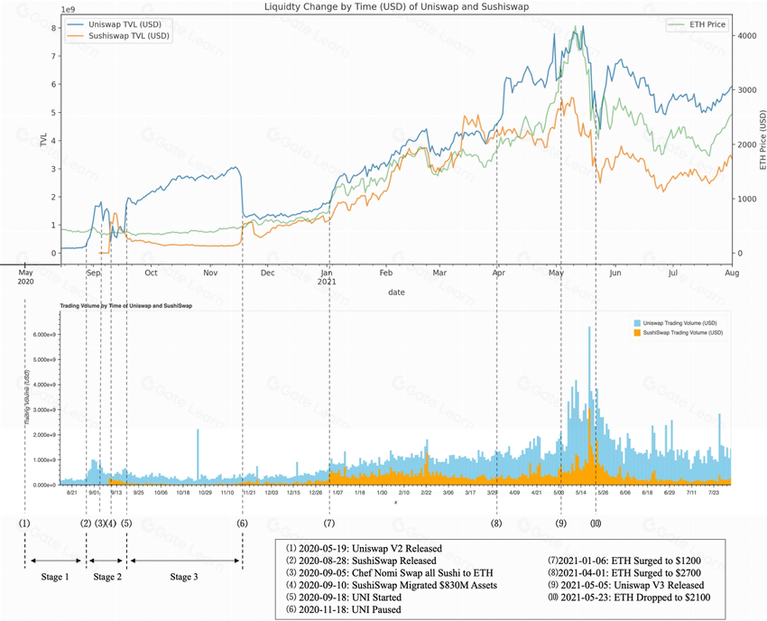 Kullanıcıları tokenlarla teşvik etmenin ve Uniswap’in temel kodunu bu şekilde kopyalamanın yanı sıra, SushiSwap Uniswap’in kullanıcılarını da olduğu gibi kendine aktardı. SushiSwap’in lansmanından sonra, neredeyse 1 milyar dolarlık likidite (o zamanki Uniswap likiditesinin yaklaşık %60’ı) Uniswap’ten SushiSwap’e transfer edildi ve SushiSwap merkeziyetsiz borsa alanında hızla yer edindi.