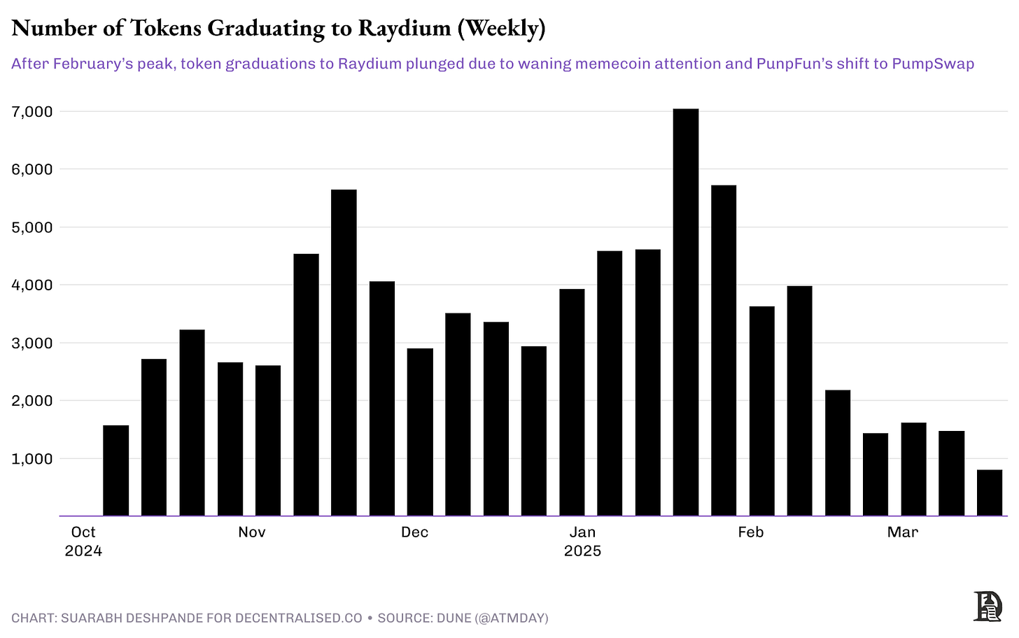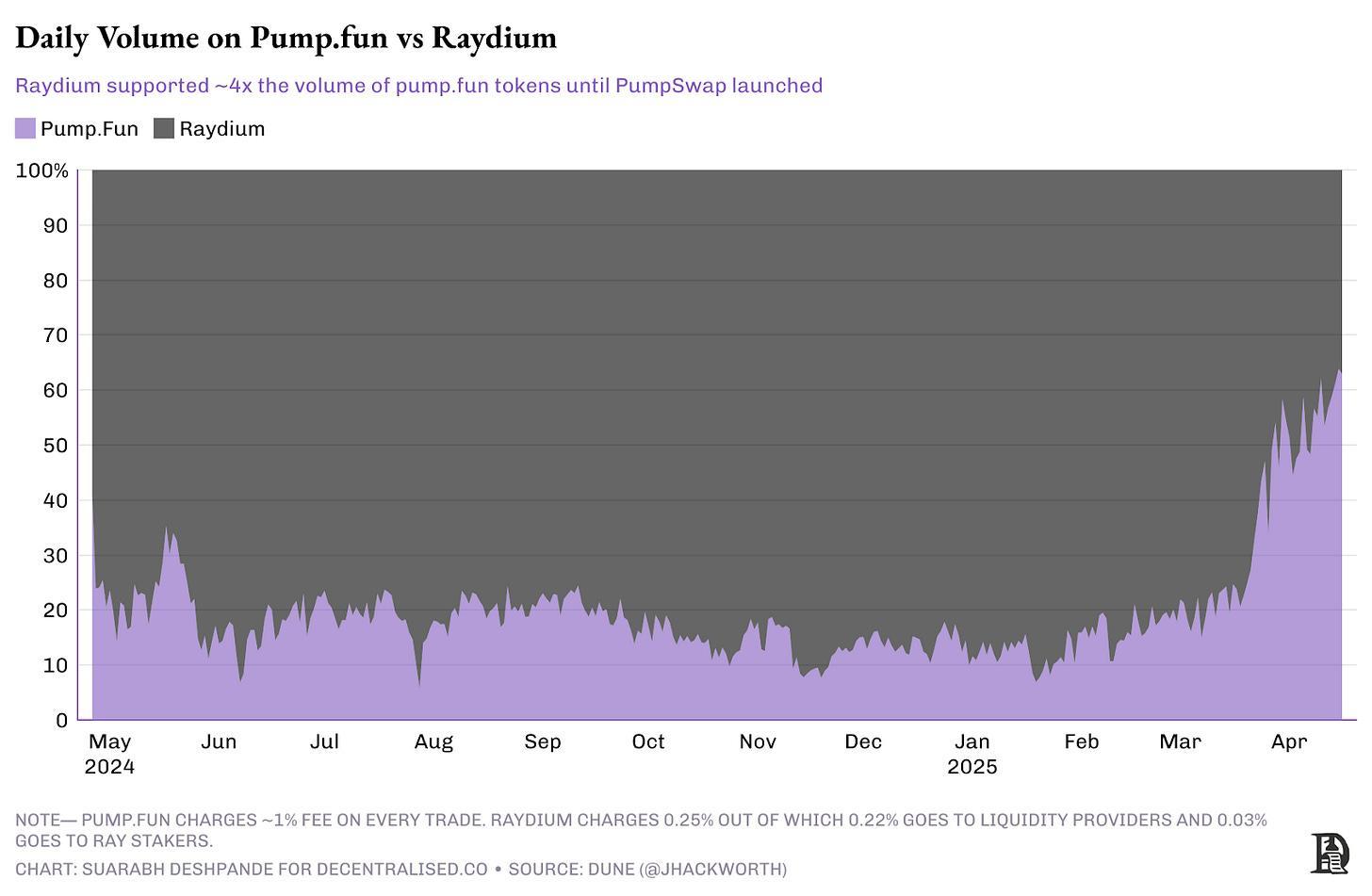 Bu refah, Pump.fun ekibinin dikkatinden kaçmadı. Ekonomi cazipti: Pump.fun platformu, yalnızca işlem gören token başına %1 ücret alırken, Raydium’un ücret yapısı %0,25 seviyesindeydi. Bu, Raydium’un Pump.fun’ın gelirine eşit olabilmesi için dört kat daha fazla işlem hacmi üretmesi gerektiği anlamına geliyordu. Raydium, derin likiditesi ve geniş kullanıcı tabanı sayesinde Ağustos 2024 ile Şubat 2025 arasında bu eşiği sürekli olarak aşmayı başardı.