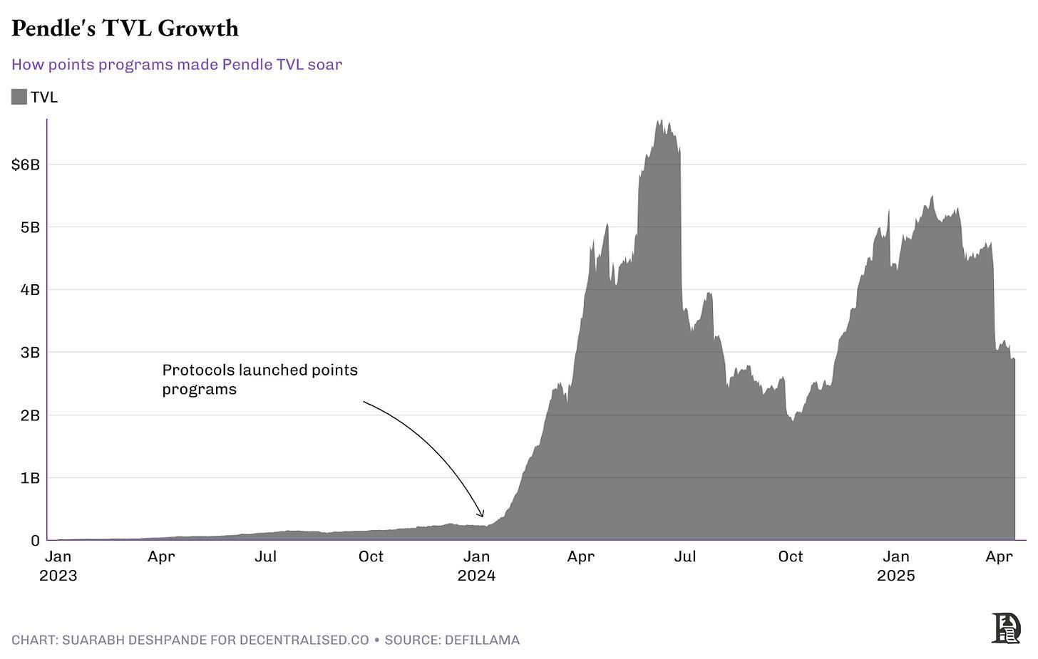 Ekip, puanlar metası için bir ürün geliştirmemiştir; bu sonucu görmemişlerdi. Ancak mükemmel bir altyapı inşa etmişlerdi ve gelişen kullanıcı davranışlarını kusursuz bir şekilde değerlendirdiler. Trend sonunda soğuduğunda ve toplam kilitli değer (TVL) yaklaşık 2.5 milyar dolara düştüğünde bile, Pendle hâlâ pre-puan-meta seviyelerinin 10-15 kat üzerinde bir büyüme elde etmeyi başardı.