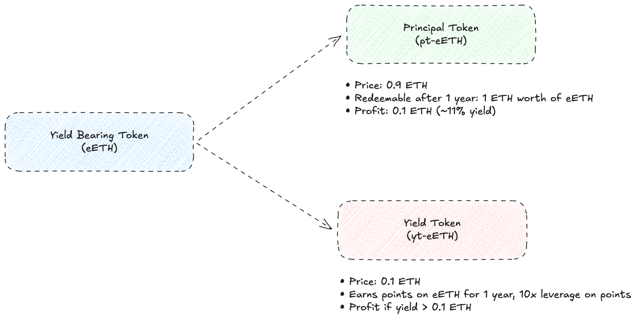 Örneğin, diyelim ki bir eETH varlığı 2000 dolar değerinde ve size günlük 24 EigenLayer puanı kazandırıyor. Burada, Principal Token (pteETH) sabit getiriyi temsil ederken, Yield Token (yteETH) değişken getiriyi temsil eder ve 200 dolara satılır. pteETH sahipleri sabit getiri karşılığında puan haklarından feragat ederken, yteETH sahipleri hem değişken getiriye hem de puanlara sahip olur. Bu durumda Sid, doğrudan 2000 dolar yatırmak yerine sadece 200 dolar karşılığında gelecekte 240 puanlık günlük bir maruziyet elde edebilir.